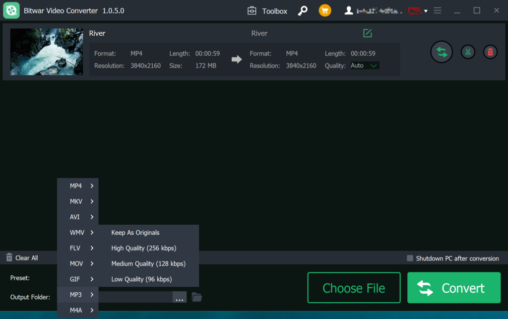 この新しいバージョンのBitwarVideo Converterは、ビデオをオーディオに変換するという新しい機能を追加します。これは、ユーザーがソフトウェアでサポートされているビデオをMP3またはM4Aオーディオに変換できることを意味します。美しいバックグラウンドミュージックを映画に保存したい場合は、この機能を使用してムービーからバックグラウンドミュージックを抽出し、無料で聴くことができます。これにより、音楽を探す手間も省けます。