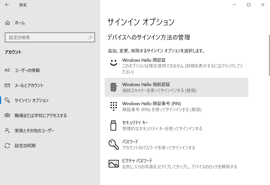 注: [設定] > [アカウント] > [サインイン オプション] で Windows Hello PIN と Windows Hello 指紋を無効にした後でのみ、これらの指示に従ってください。