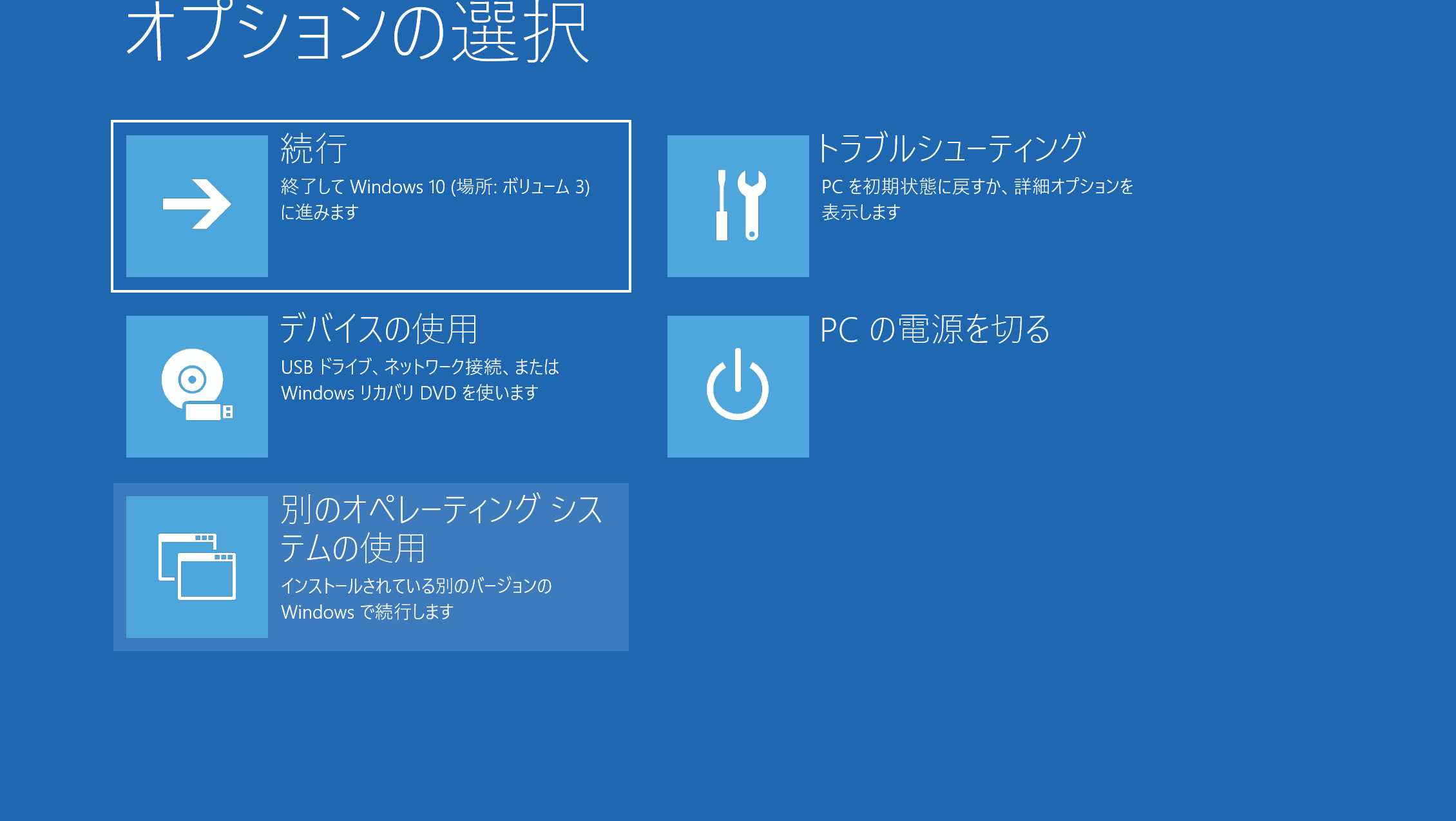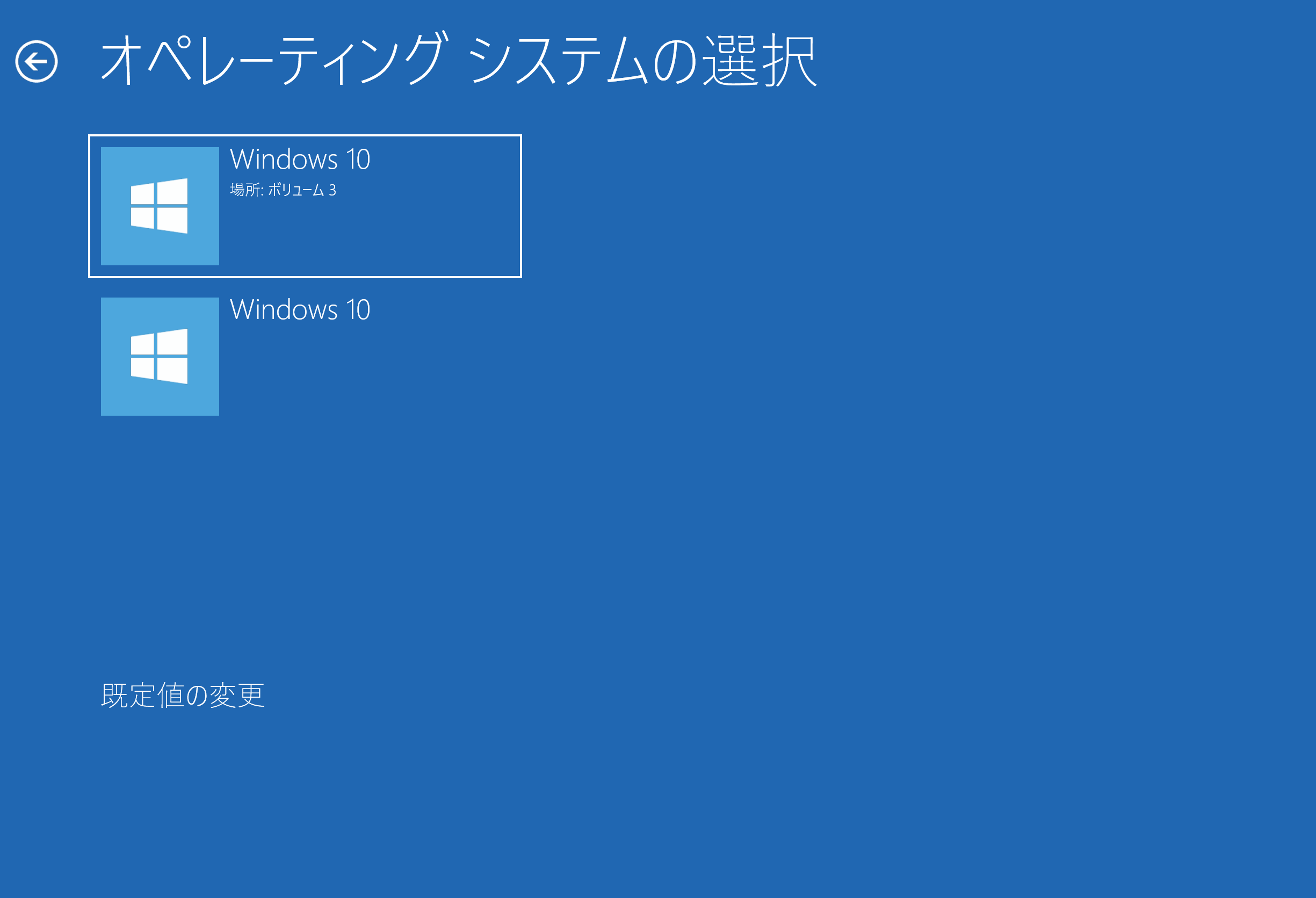 終了するには、[戻る]アイコンをクリックします。これで「オペレーティングシステムの選択」画面が表示されます。ここでは、デフォルトのオペレーティングシステムがリストの一番上に表示されます。項目をクリックすると、そのOSで起動します。