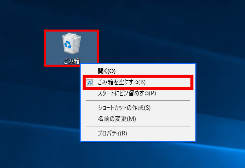 ごみ箱のアイコンを右クリックして、「ごみ箱を空にする」をクリックすることでごみ箱内のすべてのファイルを削除することができます。