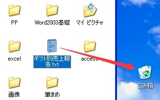 マウスで削除したいファイルやフォルダーをデスクトップのごみ箱のアイコンへドラッグ&ドロップします。