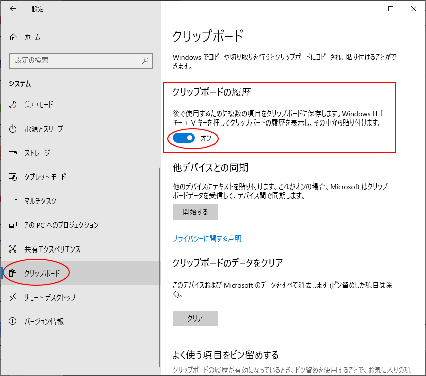 方法2.Windowsの[設定]からクリックボードを有効にする