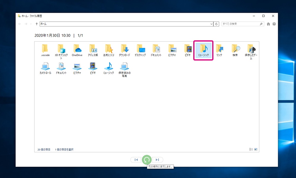 手順⑥ バックアップした日時ごとにファイルやフォルダーが表示されるので、復元したいファイル、またはフォルダーを右クリックして「復元」を選択します。
