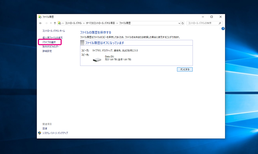 手順④ 利用できるドライブを選び、「オンにする」をクリックします。