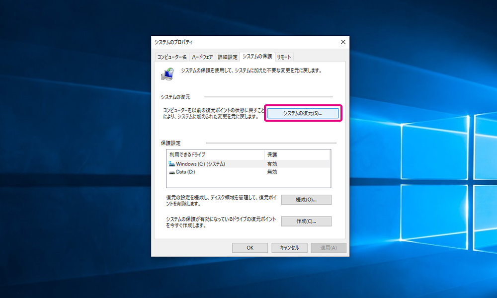 手順② 「システムの保護」の中の「システムの復元」をクリックします。