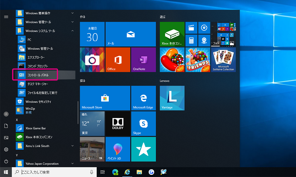 手順①「スタート」をクリックし、表示されたアプリの一覧の「W」欄から「Windowsシステムツール」をクリックします。表示された一覧から「コントロールパネル」をクリックします。