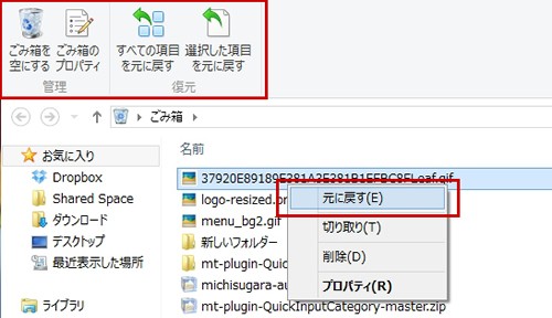 ごみ箱の中から復元する