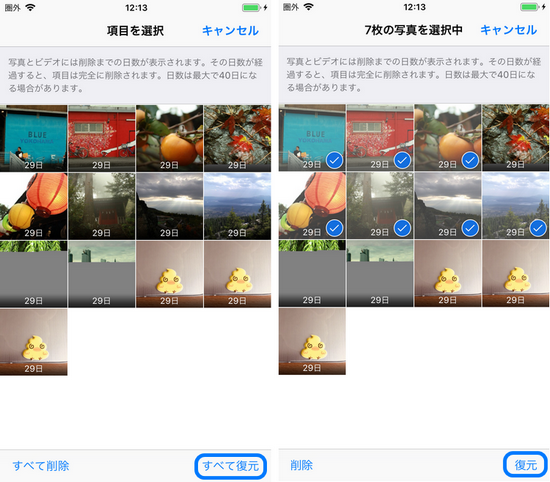右上にある「選択」を押して、右下にある「すべて復元」をタップ、それとも復元したい項目を手動的に選択します。そうしたら「復元」をタップします。