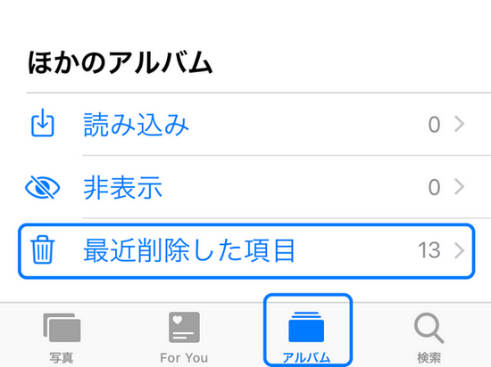 写真のアプリを開きます。アルバムの表示を選択し、「ほかのアルバム」で「最近削除した項目」をタップします。