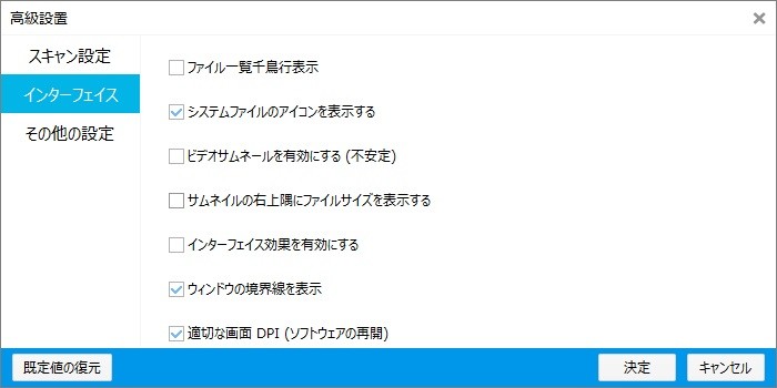 [高級設置]をクリックすると、設定ウィンドウが表示されます。スキャン設定、インターフェース設定、その他の設定の3つの設定部分が表示されます。
