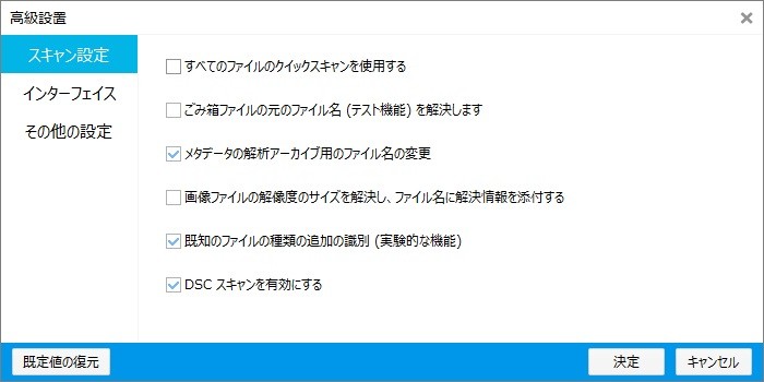 5.既知のアァイルの種類の追加の識別」(実験のな機能):有効にすると他の種類のデータもスキャンされますが、スキャン速度が遅くなり、無駄なデータが多く見つかる場合がありますので、ご注意ください。