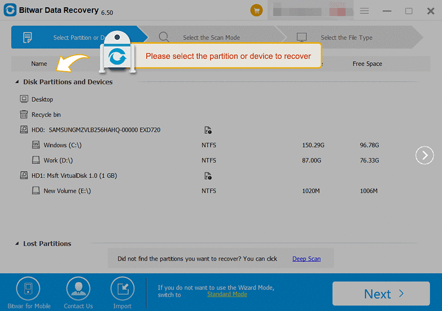●最初の段階:レスキューするデバイスとパーティションを選択します。