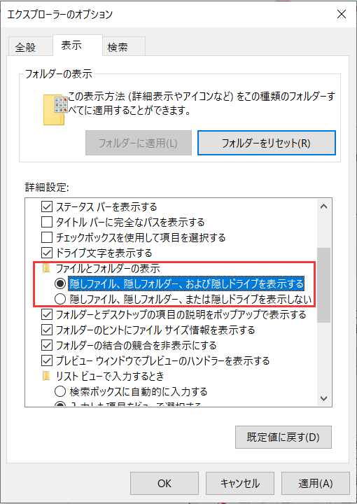 ステップ4: 検索ボックスに「フォルダーのオプション」と入力する。そして、「隠しファイル、隠しフォルダー、隠しドライブを表示する」を選択します。