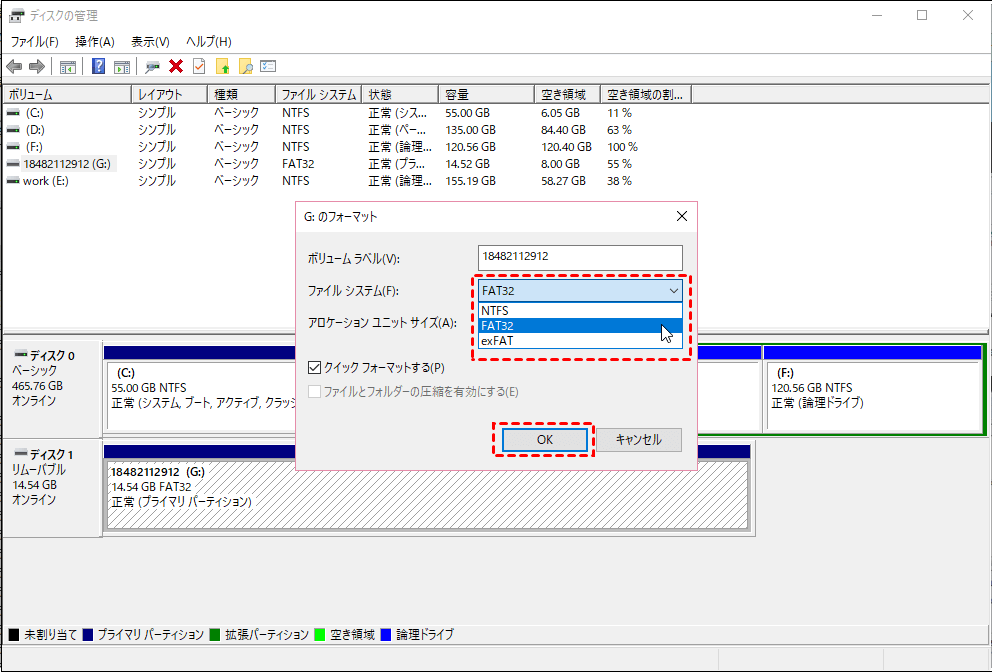 ステップ4:[クイックフォーマットする]をオンにし、[OK]ボタンをクリックして、RAWドライブをNTFSに再フォーマットします。