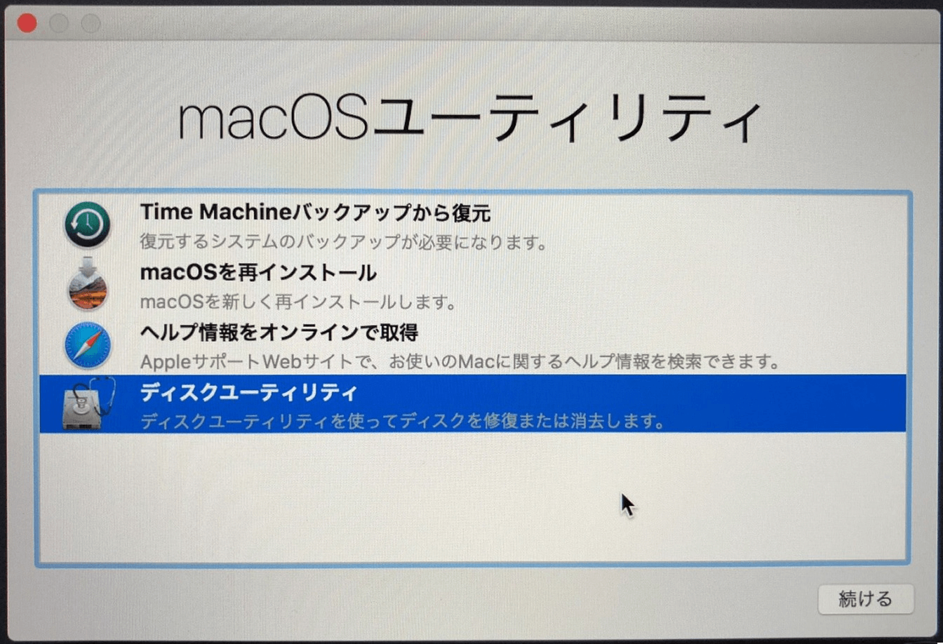 [MacOSユーティリティ]ウィンドウが表示されたら、リストの下部にある[[ディスクユーティリティ]をクリックし、[続ける]をクリックします。これにより、次のステップの別のウィンドウに移動します。