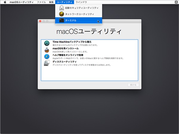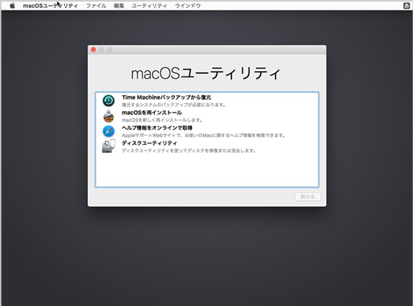まずはMacを再起動し、起動音が鳴った直後に、Commandキー(⌘)とRキーを同時に押します。これで、Macをリカバリーモードで起動させ、次のような画面が出てきます。