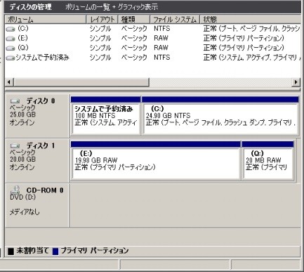 また、「ディスクの管理」でパーティションのステータスを確認します。