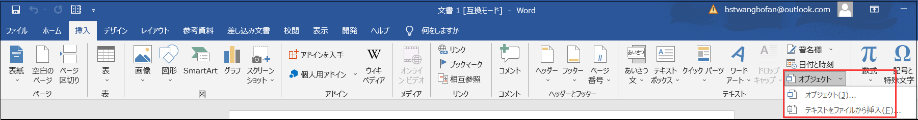 ステップ1.新しいワード文書を開き、「挿入」タブをクリックして「オブジェクト」を展開し、「テキストをファイルから挿入」を選択します。