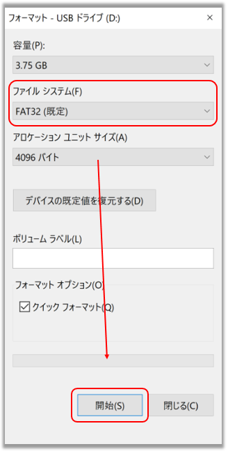 Windows10パソコンでUSBメモリのファイルシステムをFAT32にフォーマットする方法