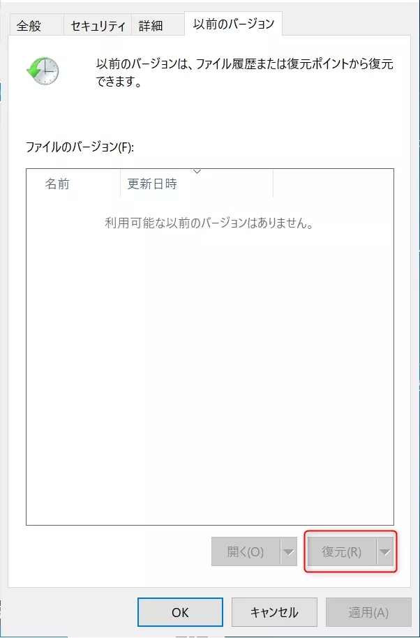 ステップ2.「以前のバージョン」タブをクリックします。以前のバージョンが存在する場合はリストが表示されるので、バージョンを選んで「復元」をクリックします。