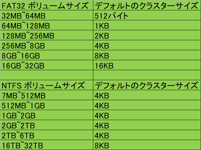 FAT32とNTFSのアロケーションユニットサイズの比較