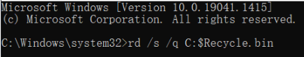 ステップ2.コマンド「rd /s /q C:$Recycle.bin」を入力して、Enterキーを押します。(Cを実際のドライブの番号に変更する)
