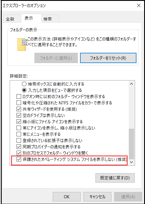 ステップ4.「保護されたオペレーティングシステム ファイルを表示しない」にチェックを外します。