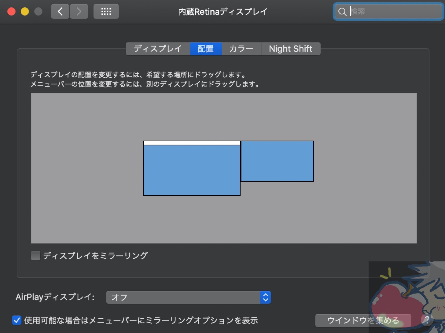 ステップ2.「配置」をクリックして、「ディスプレイをミラーリング」にチェックを外します(外部ディスプレイに元のディスプレイと同じ画面を表示したい場合は除く)。