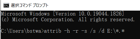 そうすると、コマンドプロンプトが起動するので、画面に「attrib –h –r –s /s /d E(USBのドライブ文字):*.*」と入力します。