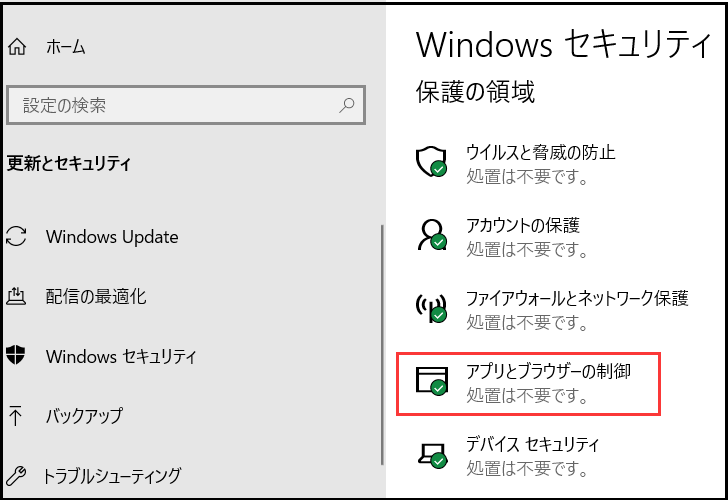 ステップ3.「Windowsセキュリティ」>「アプリ都ブラウザの制御」をクリックします。