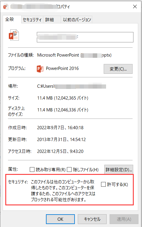 ステップ2.「全般」タブのセキュリティ部分に「このファイルは他のコンピュータから取得したものです。このコンピュータを保護するため、このファイルへのアクセスはブロックされる可能性があります。」の許可にチェックを入れます。