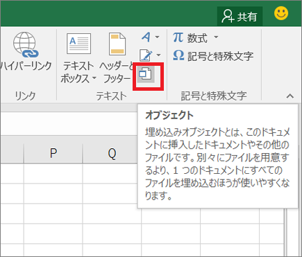 2.[挿入] タブの[テキスト]グループで、[オブジェクト]をクリックします。