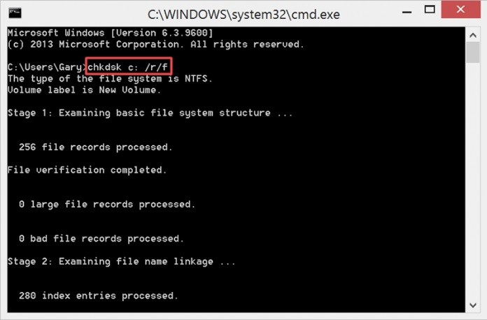 ステップ2:コマンドプロンプトで、「chkdsk drive : /r /f」コマンドを入力し、Enterキーを押します。(driveをドライブ文字に置き換えます)
