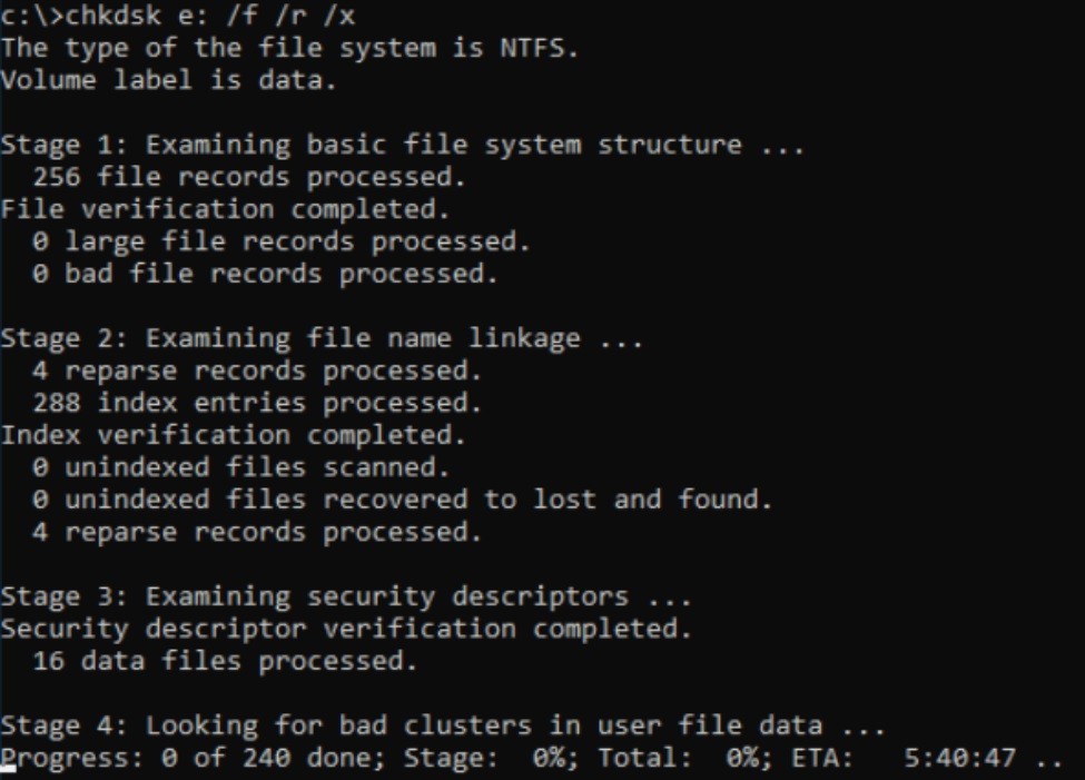 2.「chkdsk E:/f/r/x」コマンドを入力します。コマンドプロンプトのEをSDカードのドライブレターに置き換えてください。