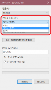 ステップ4.ファイルシステムにFAT32を選択して、「クイックフォーマット」にチェックを入れて、「開始」をクリックします。