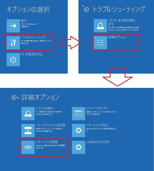 スタートアップ修復はWindowsの機能の一つです。スタートアップ修復を実行すると、「ディスクのエラーを確認しています。完了するまで1時間以上かかる場合があります。」エラーが解消できる可能性があります。スタートアップ修復の操作手順は下記の通りです。