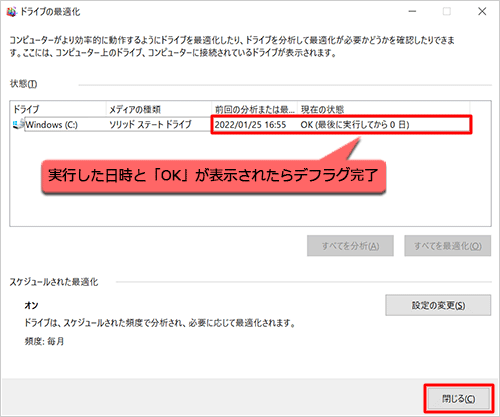 3.「前回の分析または最適化」欄に実行した日時が表示され、「現在の状態」に「OK」と表示されたらデフラグ完了です。「閉じる」をクリックします。