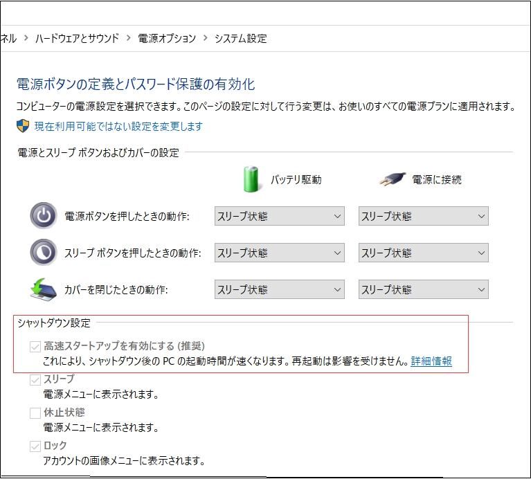 高速スタートアップ機能は、起動処理を高速化するためのものです。SSDの読み書き速度が速いので、SSD搭載のパソコンは起動が速いです。高速スタートアップを有効にしても意味がありません。