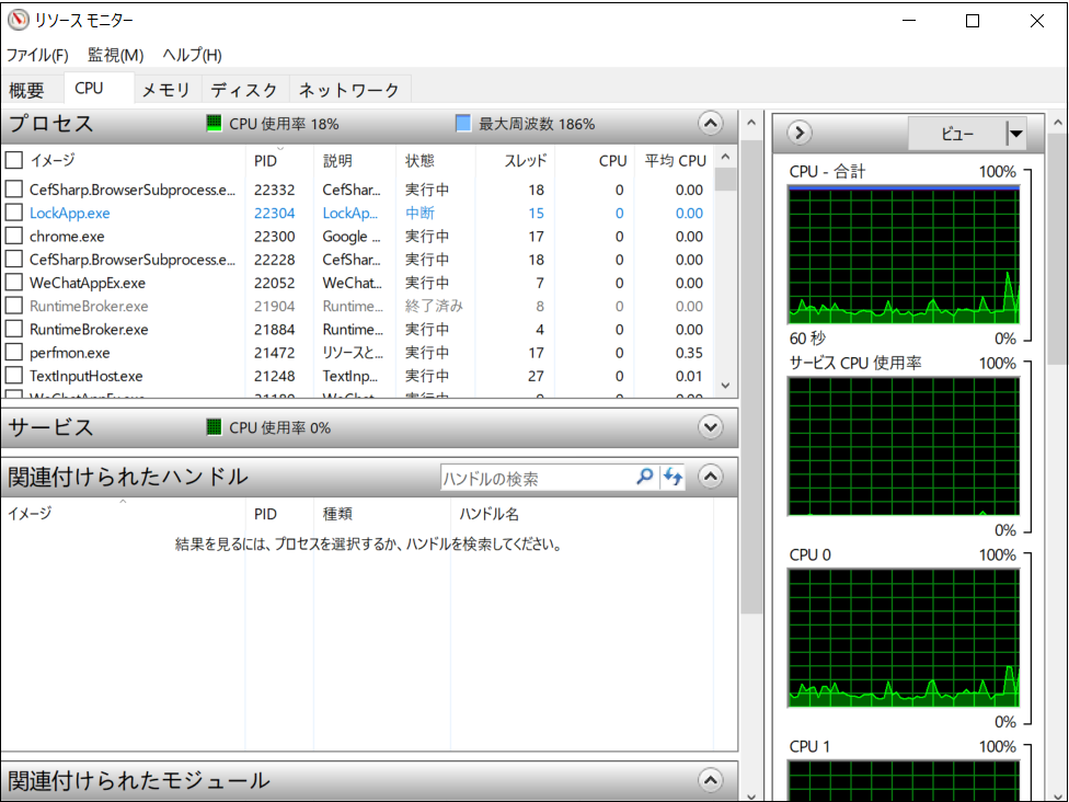 ステップ2.リソースモニターで、「CPU」タブをクリックします。 次に、「関連つけられたハンドル」の検索ボックスに、削除したいフォルダーの名前を入力して「Enter」キーを押します。