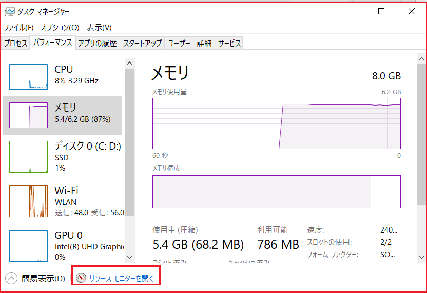 タスクマネージャーを表示したら、「パフォーマンス」タブをクリックし、「リソースモニターを開く」をクリックします。