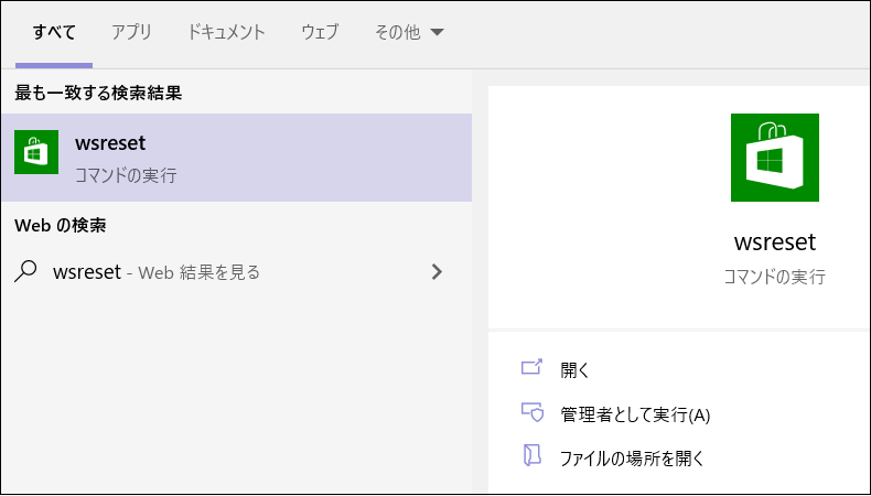 - 検索結果から「wsreset – コマンドの実行」をクリックします。黒いウィンドウが開き、Windowsストアのキャッシュがリセットされます。このウィンドウは自動的に閉じられ、Microsoft Storeが起動します。