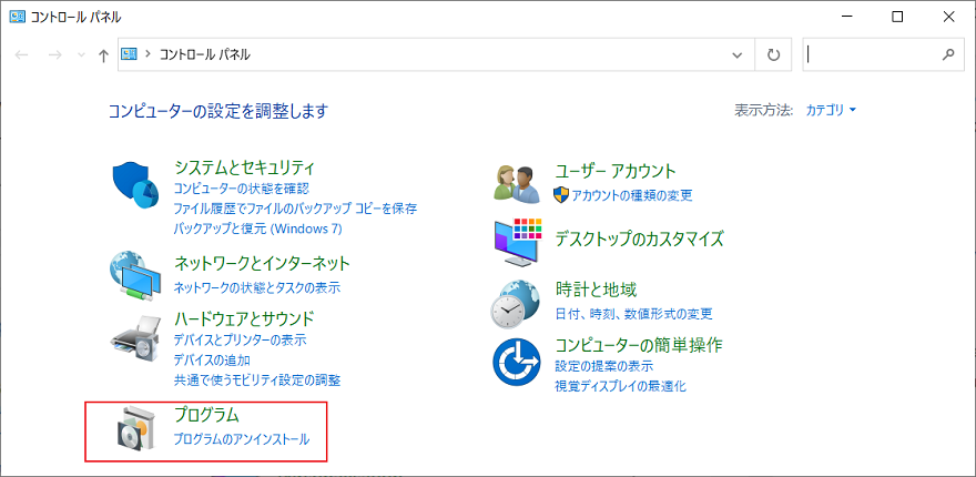 - コントロールパネルを起動し、「プログラム」オプションから「プログラムのアンインストールまたは変更」を選択します。