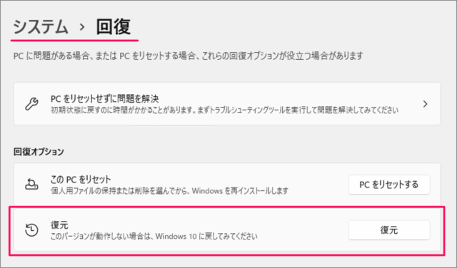 - [設定]で[システム]>[回復]を選択します。