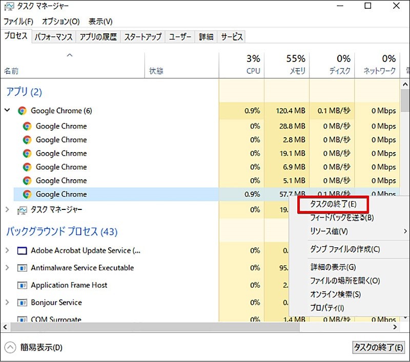 WindowsでGoogle Chromeを終了するには、タスクマネージャを開きます(スタートボタンを右クリックする)。「プロセス」タブでGoogle Chromeを右クリックし、コンテキストメニューから「タスクの終了」を選択します。