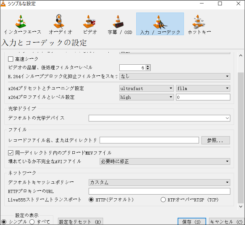 ⑤「入力/コーデック」に移動し、「破損または不完全なAVIファイル」オプションで「修正」を選択し、「保存」をクリックします。