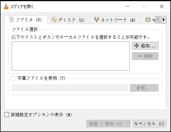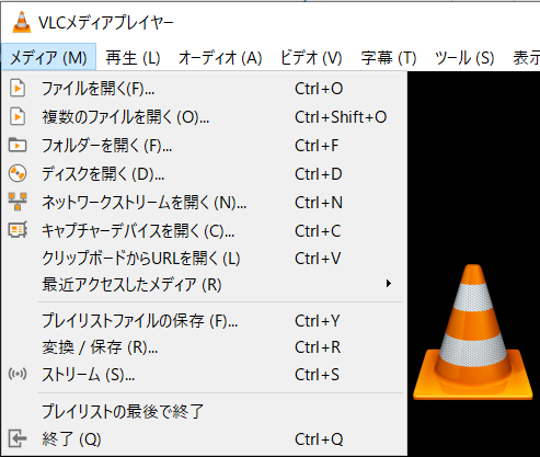 ①VLCプレーヤーを起動し、「メディア」から「変換/保存」を選択します。