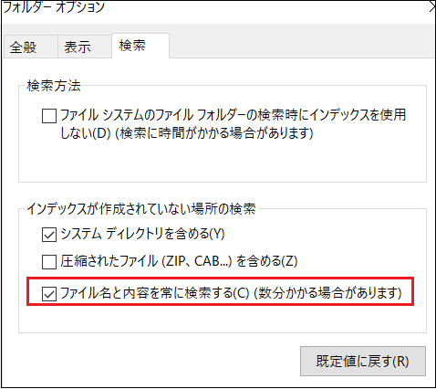- 「ファイル名と内容を常に検索する」にチェックを入れて「OK」をクリックします。