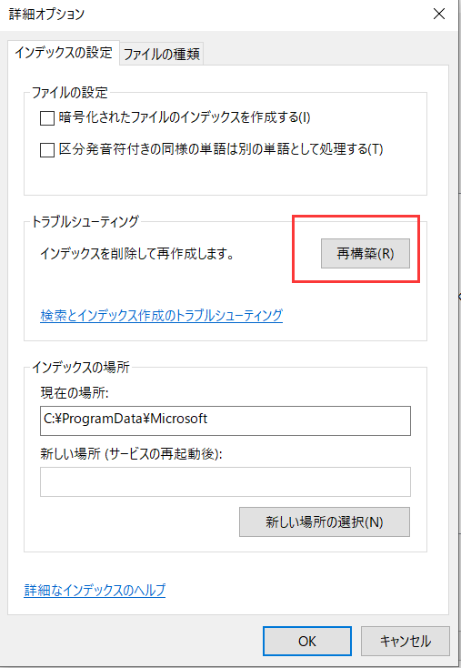 [トラブルシューティング]で、[検索とインデックス作成のトラブルシューティング]を選択します。すると、4つのオプションが表示されます。