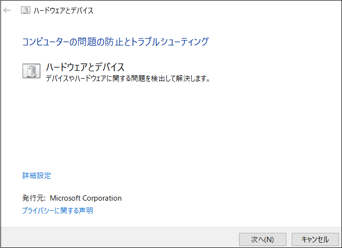 3.「ハードウェアとデバイス」ウィンドウで、「次へ」をクリックして、トラブルシューティングを実行します。