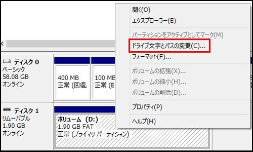 ディスクの管理でHDDのドライブレターがないか競合していることを確認